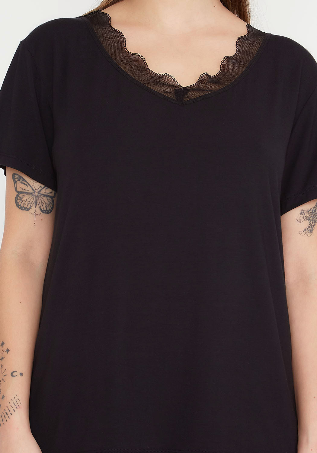 Pijama de viscosa con su parte superior color negro, mangas cortas y cuello en V. Parte inferior tipo short con diseño animal print en color negro y café, con bolsillos